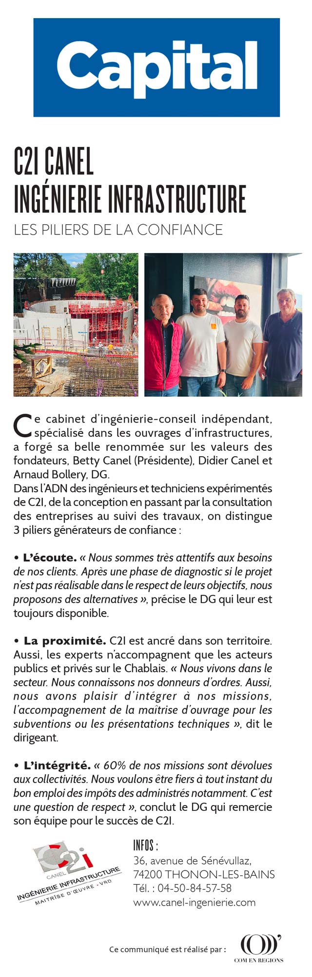 Créé le 27 juillet 2015, CANEL INGENIERIE INFRASTRUCTURE (C2I) s’est imposé comme un acteur incontournable de l’ingénierie VRD, de l’aménagement urbain et de la maîtrise d’œuvre en Chablais.
